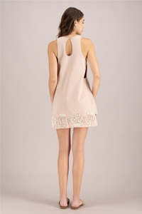 Vestido mini de lino sin mangas con detalles de conchas bordados a mano en tonos naturales.
